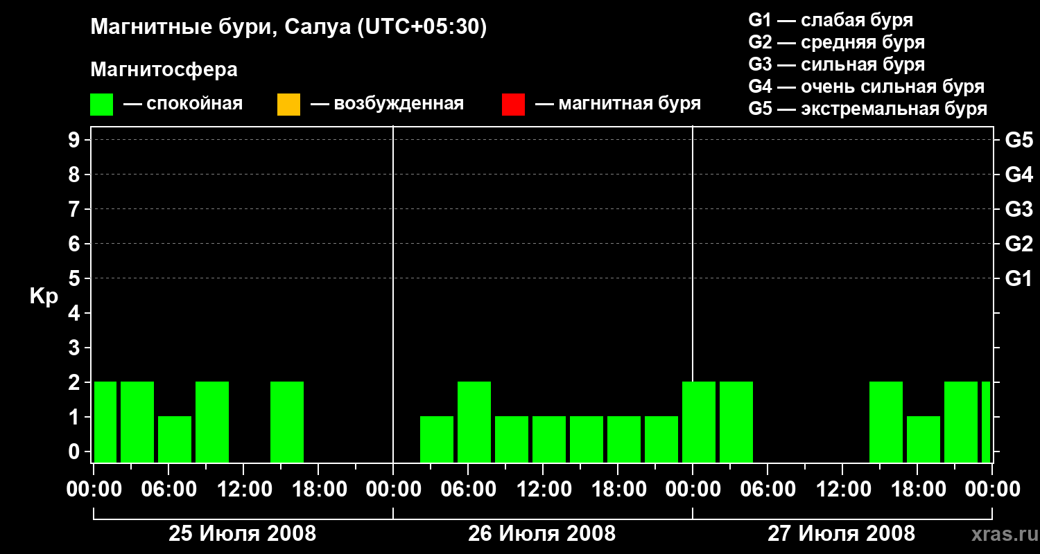 Изменения геомагнитного индекса Kp с 25 по 27 июля 2008 года для средних широт