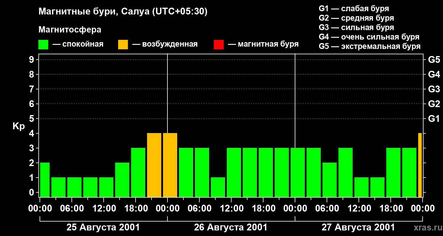 Изменения геомагнитного индекса Kp с 25 по 27 августа 2001 года для средних широт