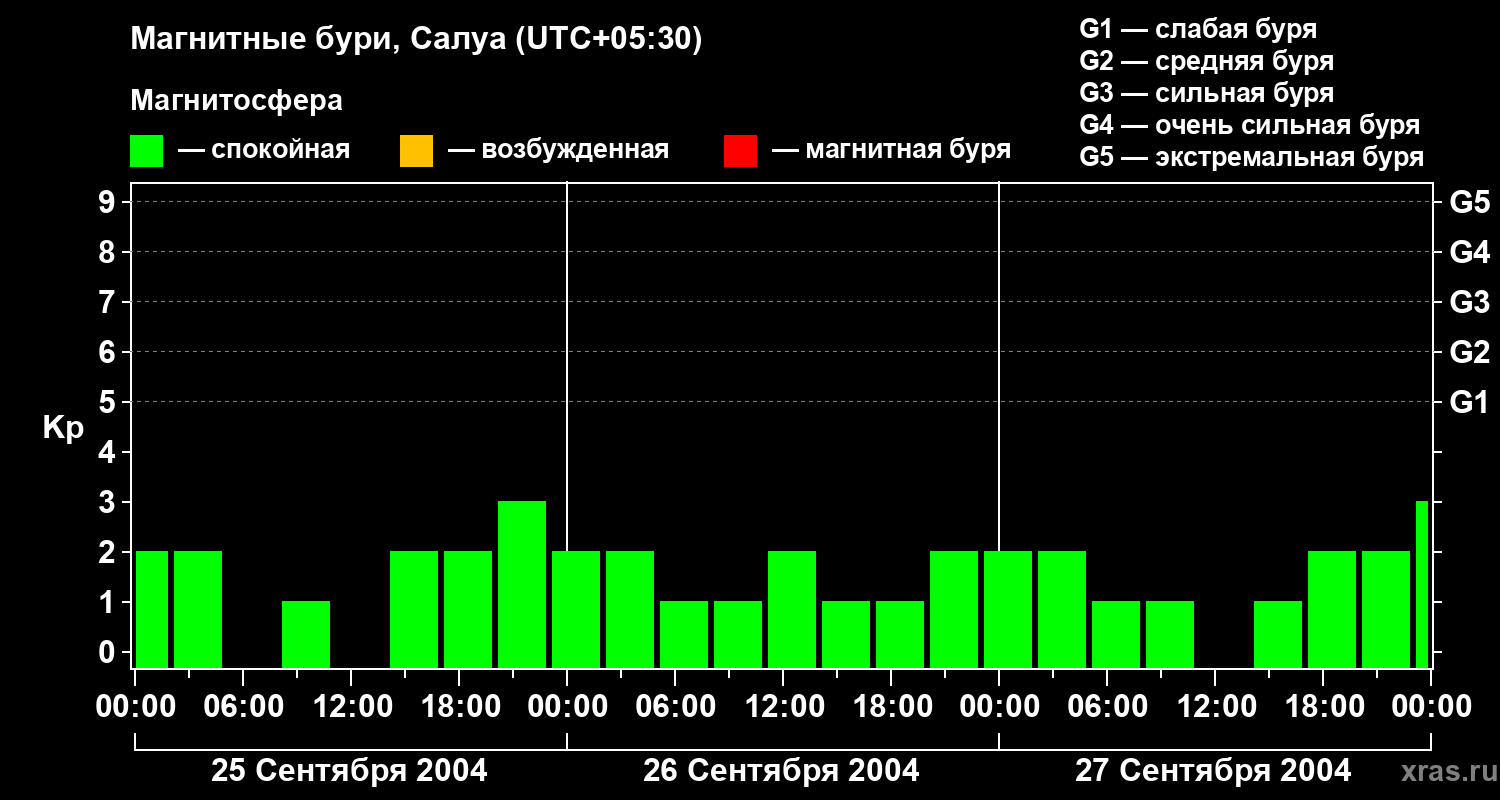 Изменения геомагнитного индекса Kp с 25 по 27 сентября 2004 года для средних широт