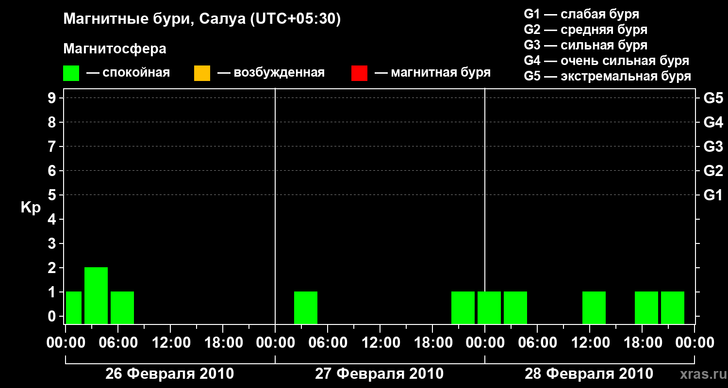 Изменения геомагнитного индекса Kp с 26 по 28 февраля 2010 года для средних широт