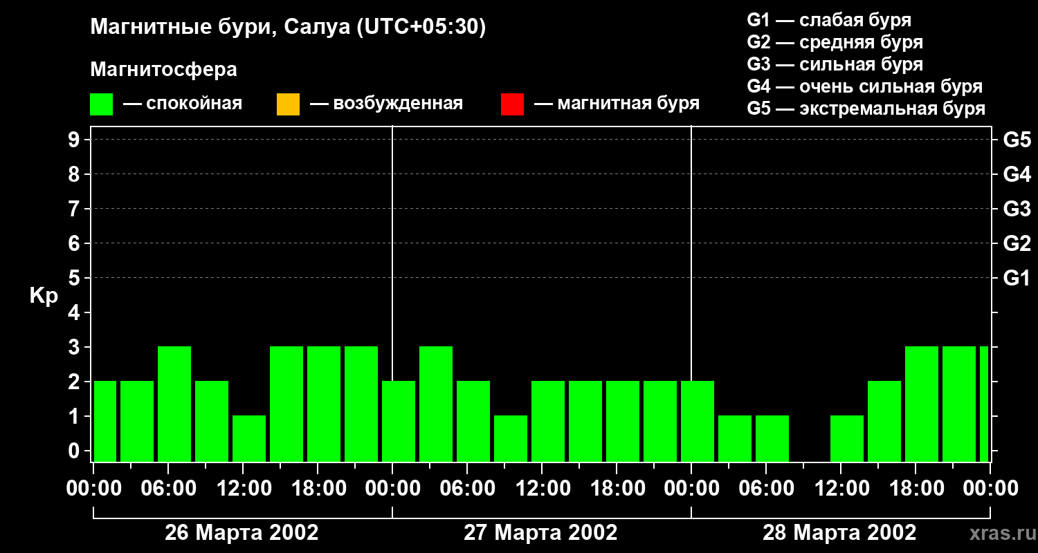 Изменения геомагнитного индекса Kp с 26 по 28 марта 2002 года для средних широт