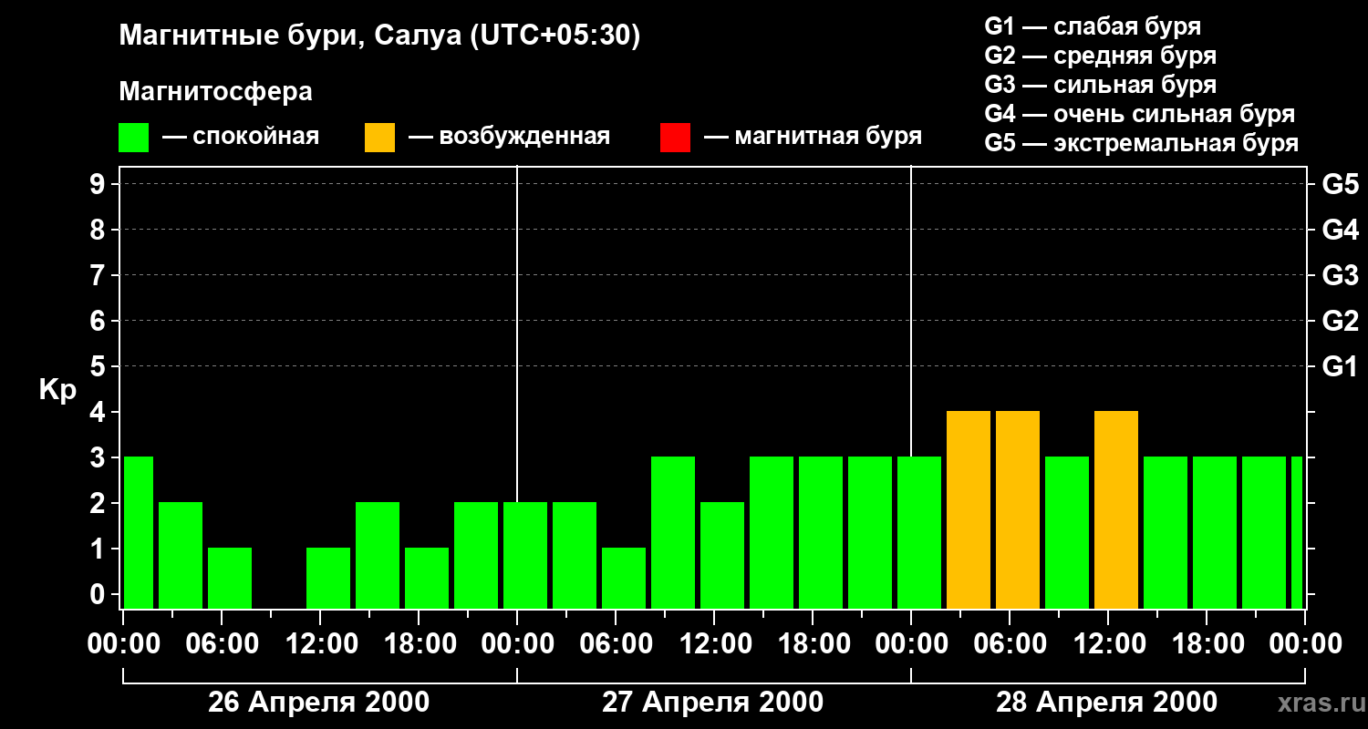 Изменения геомагнитного индекса Kp с 26 по 28 апреля 2000 года для средних широт