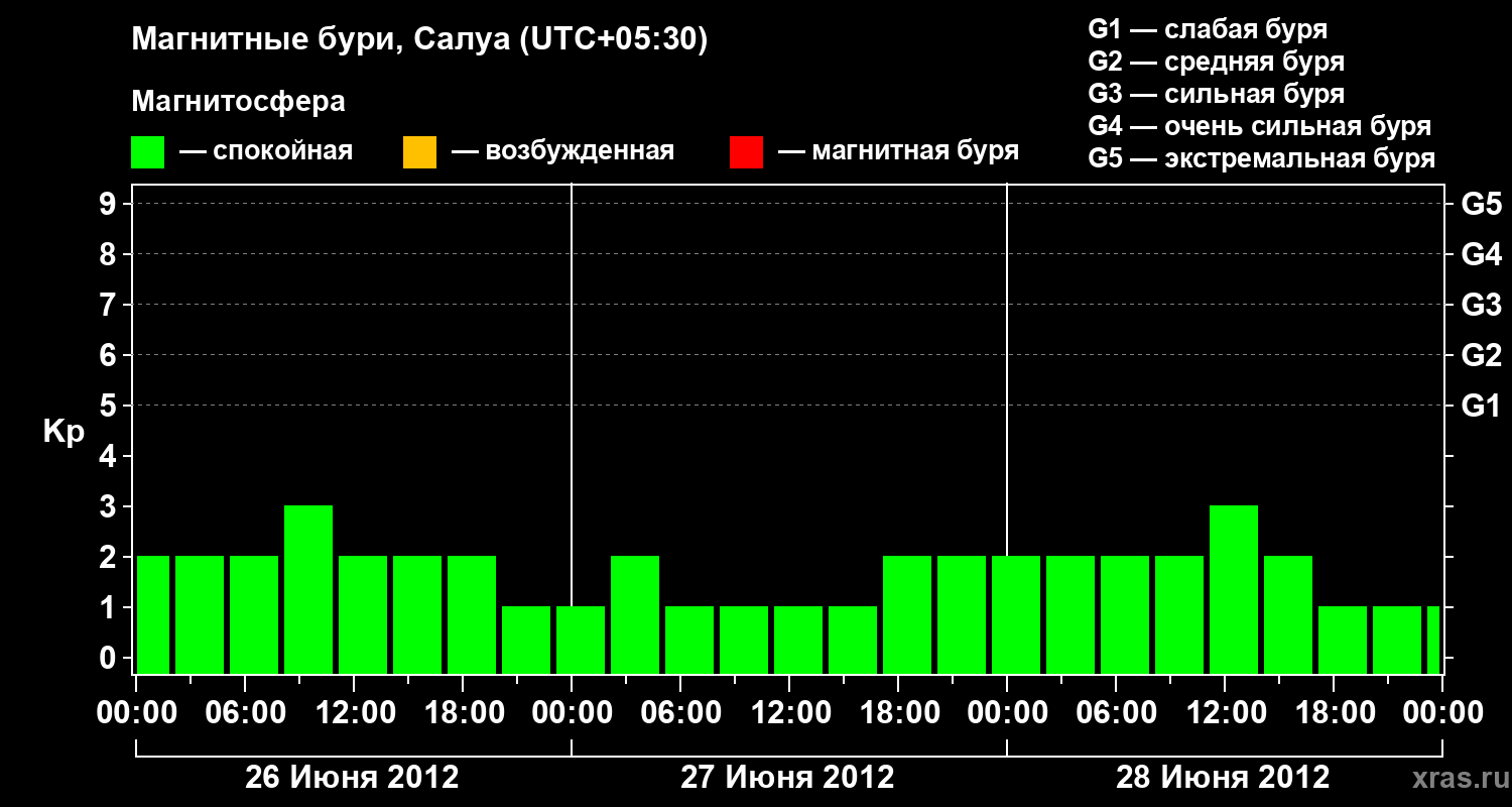 Изменения геомагнитного индекса Kp с 26 по 28 июня 2012 года для средних широт