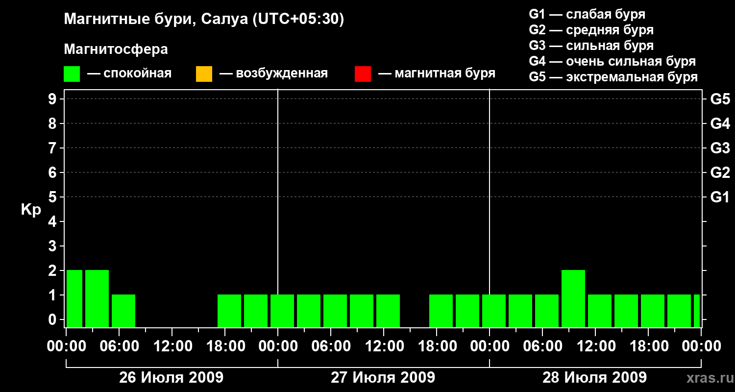 Изменения геомагнитного индекса Kp с 26 по 28 июля 2009 года для средних широт