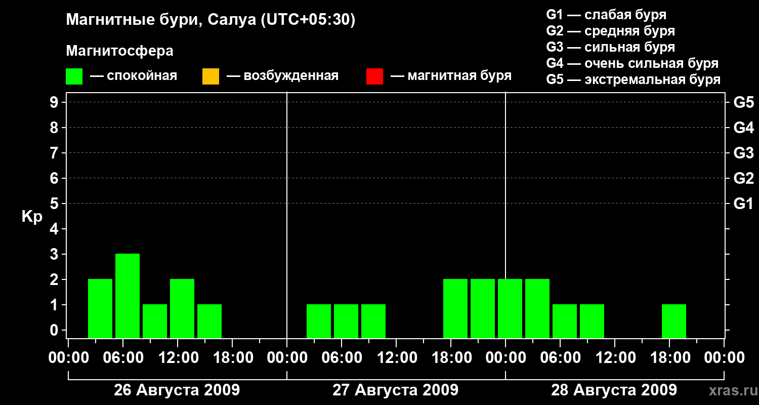 Изменения геомагнитного индекса Kp с 26 по 28 августа 2009 года для средних широт