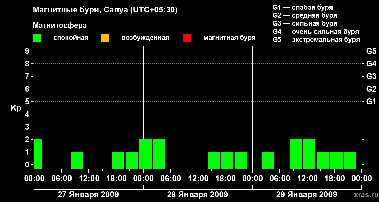 Изменения геомагнитного индекса Kp с 27 по 29 января 2009 года для средних широт