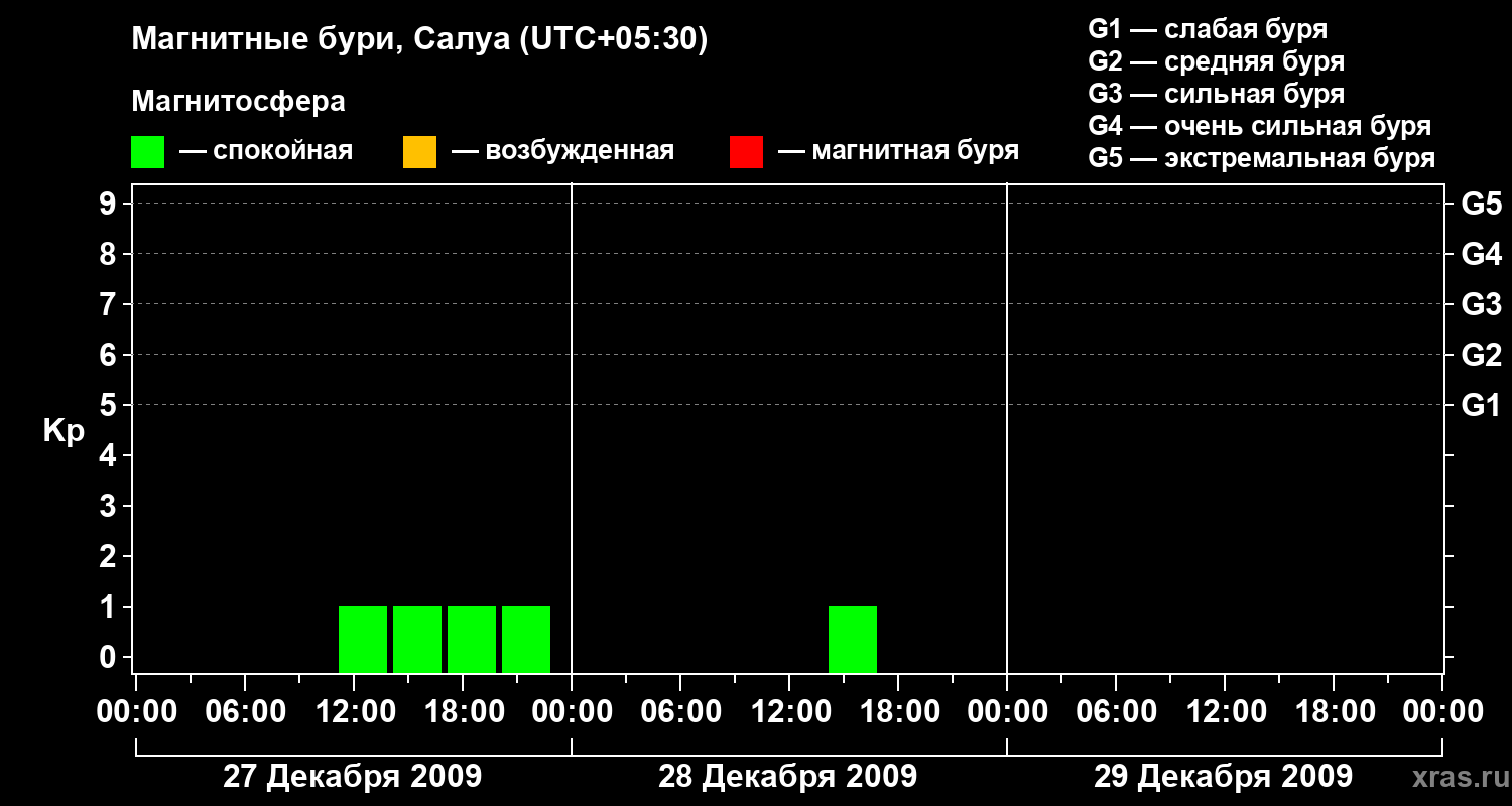 Изменения геомагнитного индекса Kp с 27 по 29 декабря 2009 года для средних широт