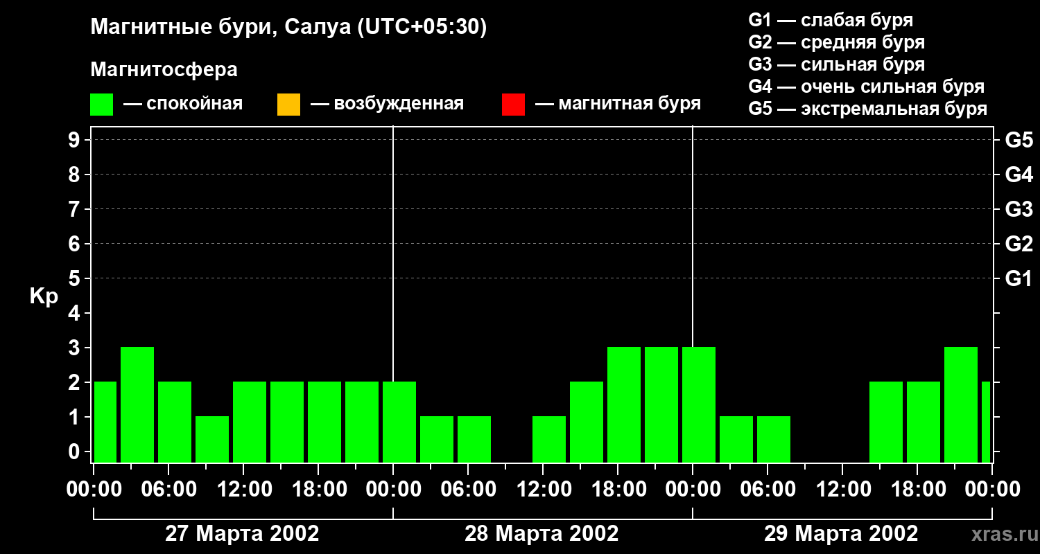 Изменения геомагнитного индекса Kp с 27 по 29 марта 2002 года для средних широт