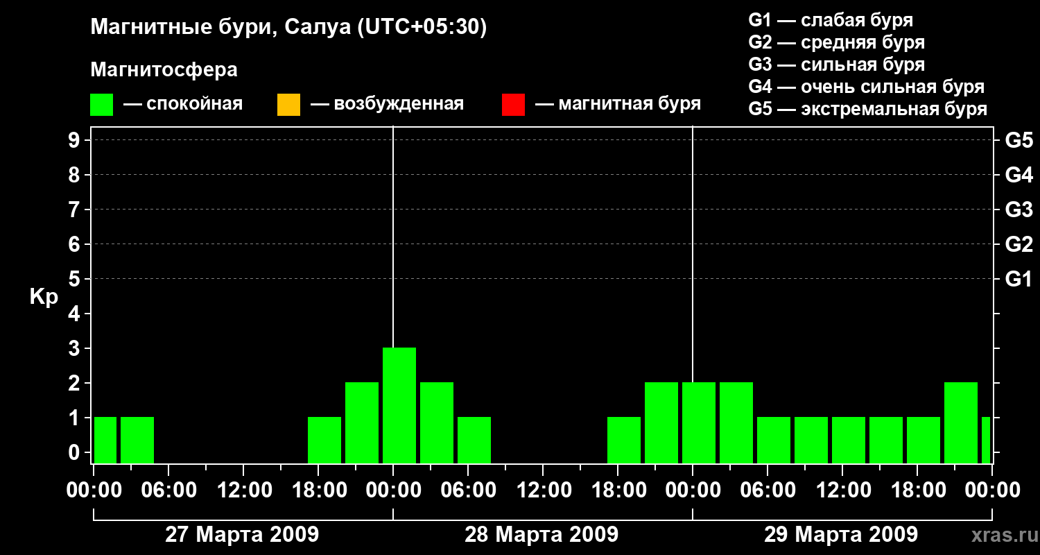 Изменения геомагнитного индекса Kp с 27 по 29 марта 2009 года для средних широт