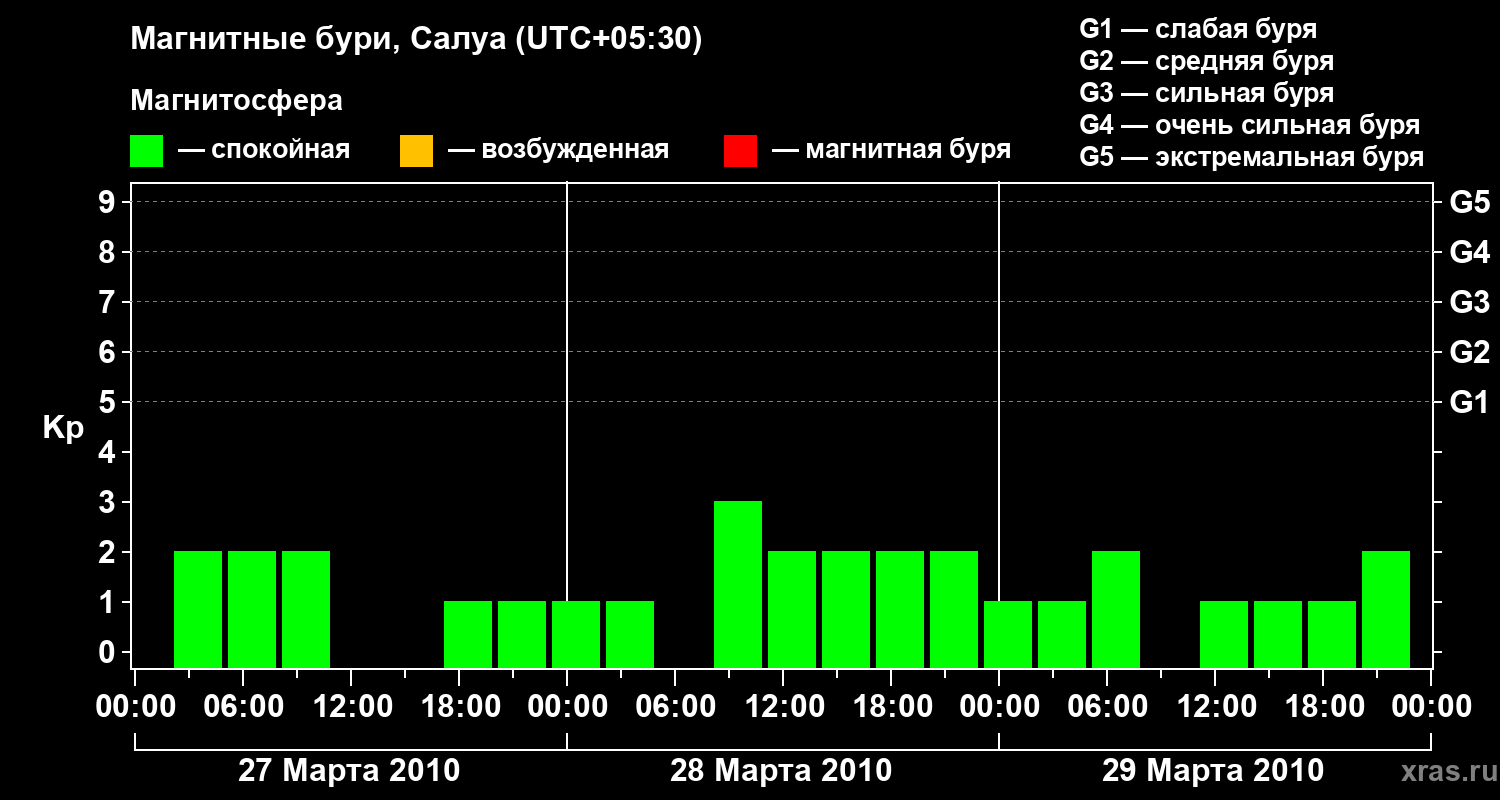 Изменения геомагнитного индекса Kp с 27 по 29 марта 2010 года для средних широт