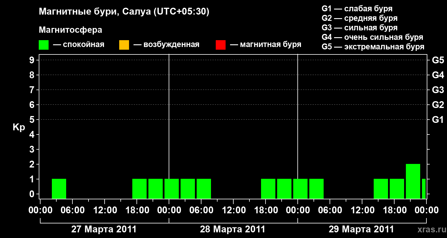 Изменения геомагнитного индекса Kp с 27 по 29 марта 2011 года для средних широт