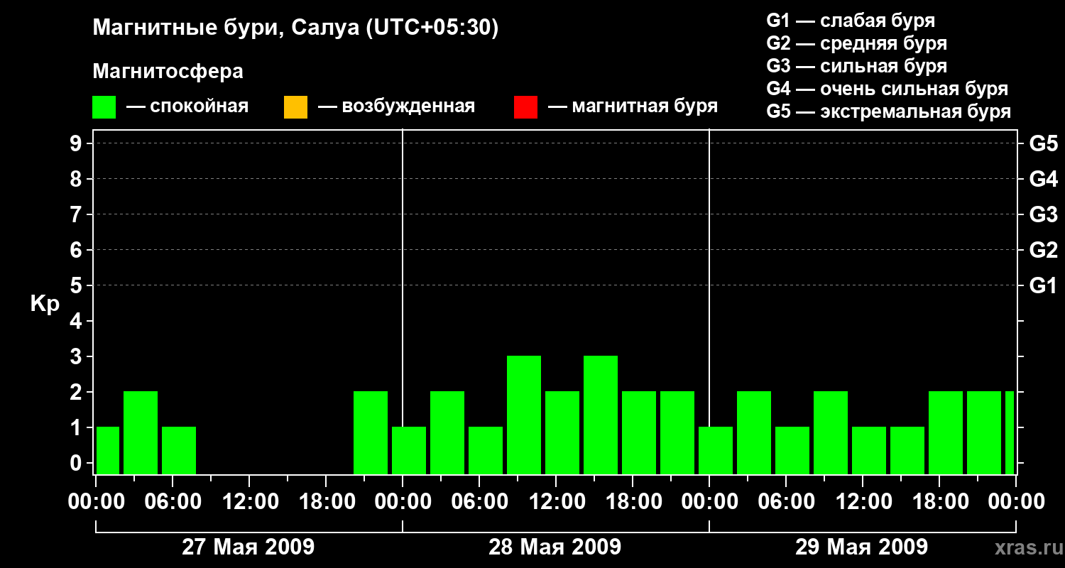 Изменения геомагнитного индекса Kp с 27 по 29 мая 2009 года для средних широт