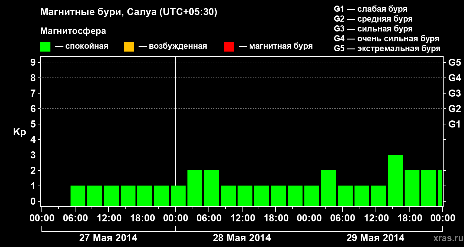 Изменения геомагнитного индекса Kp с 27 по 29 мая 2014 года для средних широт