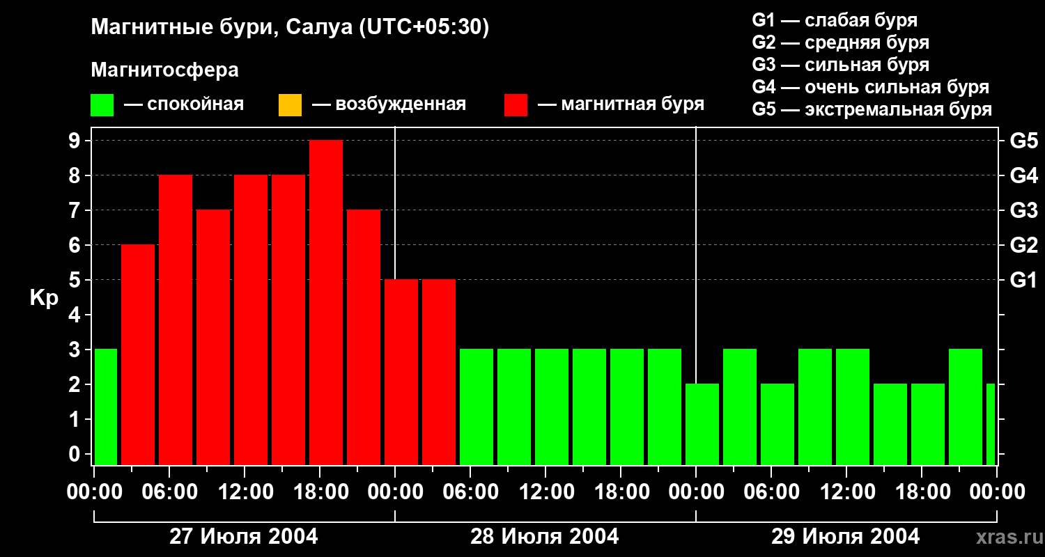 Изменения геомагнитного индекса Kp с 27 по 29 июля 2004 года для средних широт