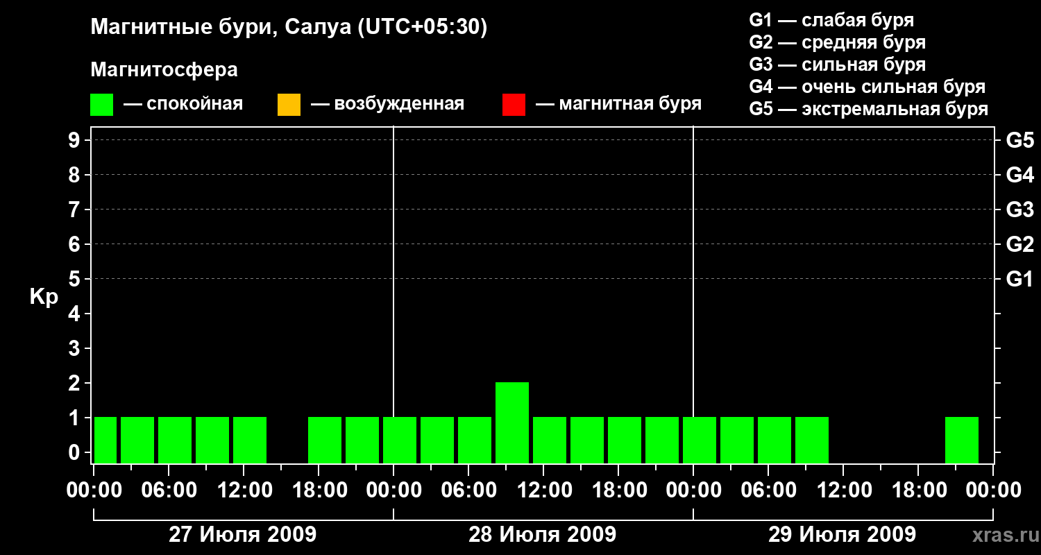 Изменения геомагнитного индекса Kp с 27 по 29 июля 2009 года для средних широт