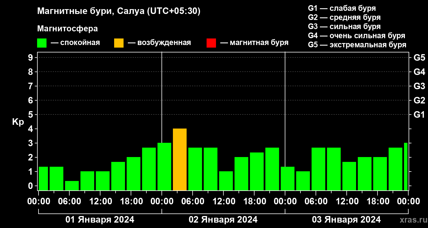 Изменения геомагнитного индекса Kp с 1 по 3 января 2024 года для средних широт