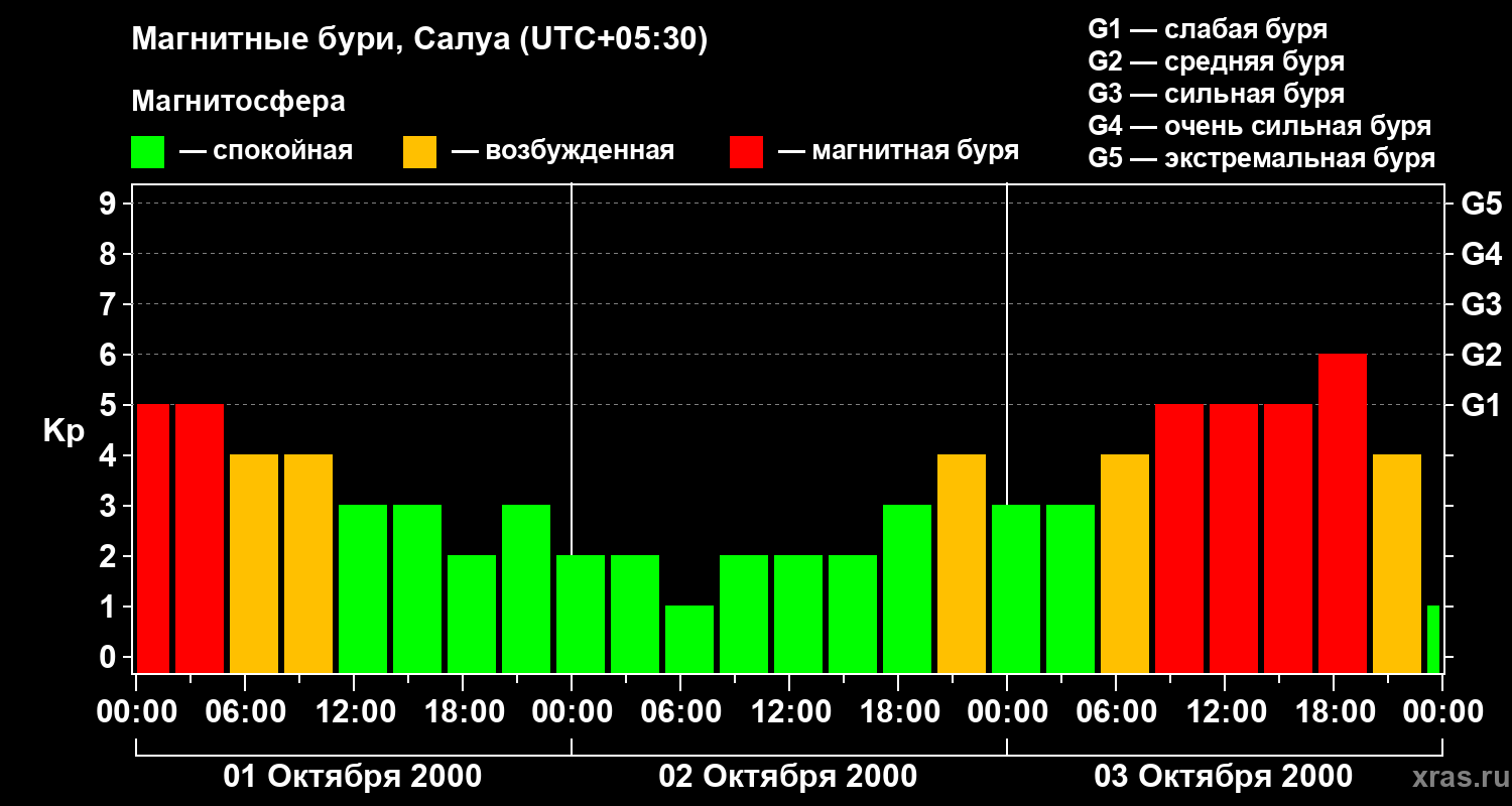 Изменения геомагнитного индекса Kp с 1 по 3 октября 2000 года для средних широт