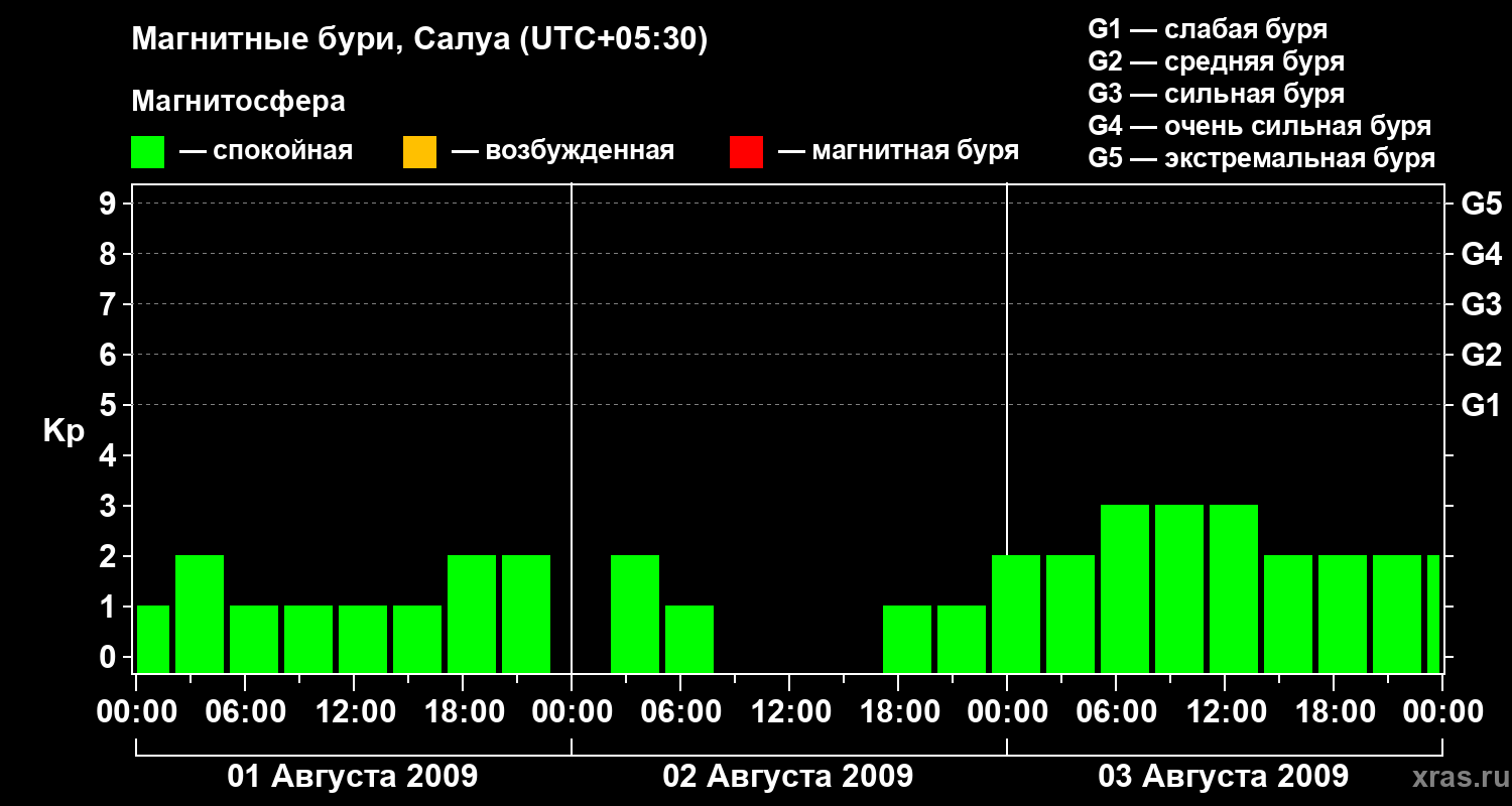 Изменения геомагнитного индекса Kp с 1 по 3 августа 2009 года для средних широт