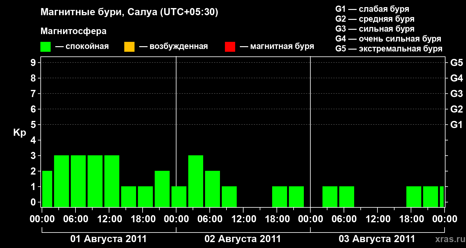Изменения геомагнитного индекса Kp с 1 по 3 августа 2011 года для средних широт