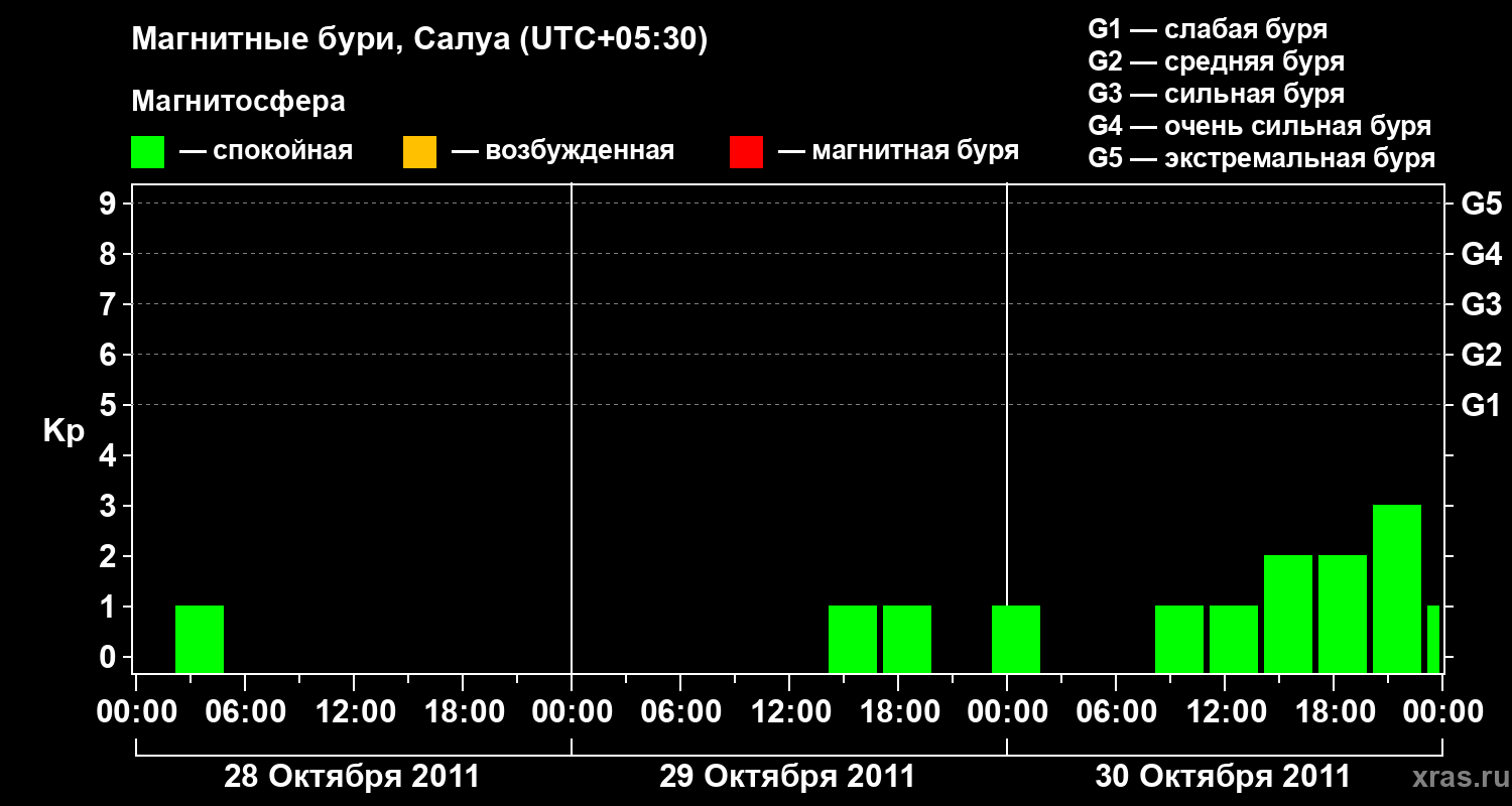 Изменения геомагнитного индекса Kp с 28 по 30 октября 2011 года для средних широт