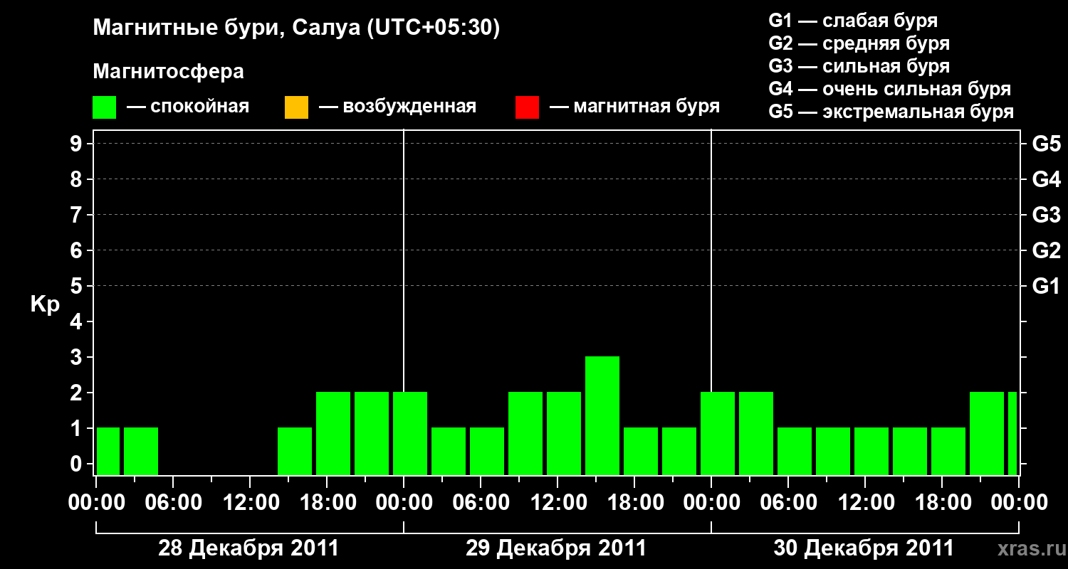 Изменения геомагнитного индекса Kp с 28 по 30 декабря 2011 года для средних широт
