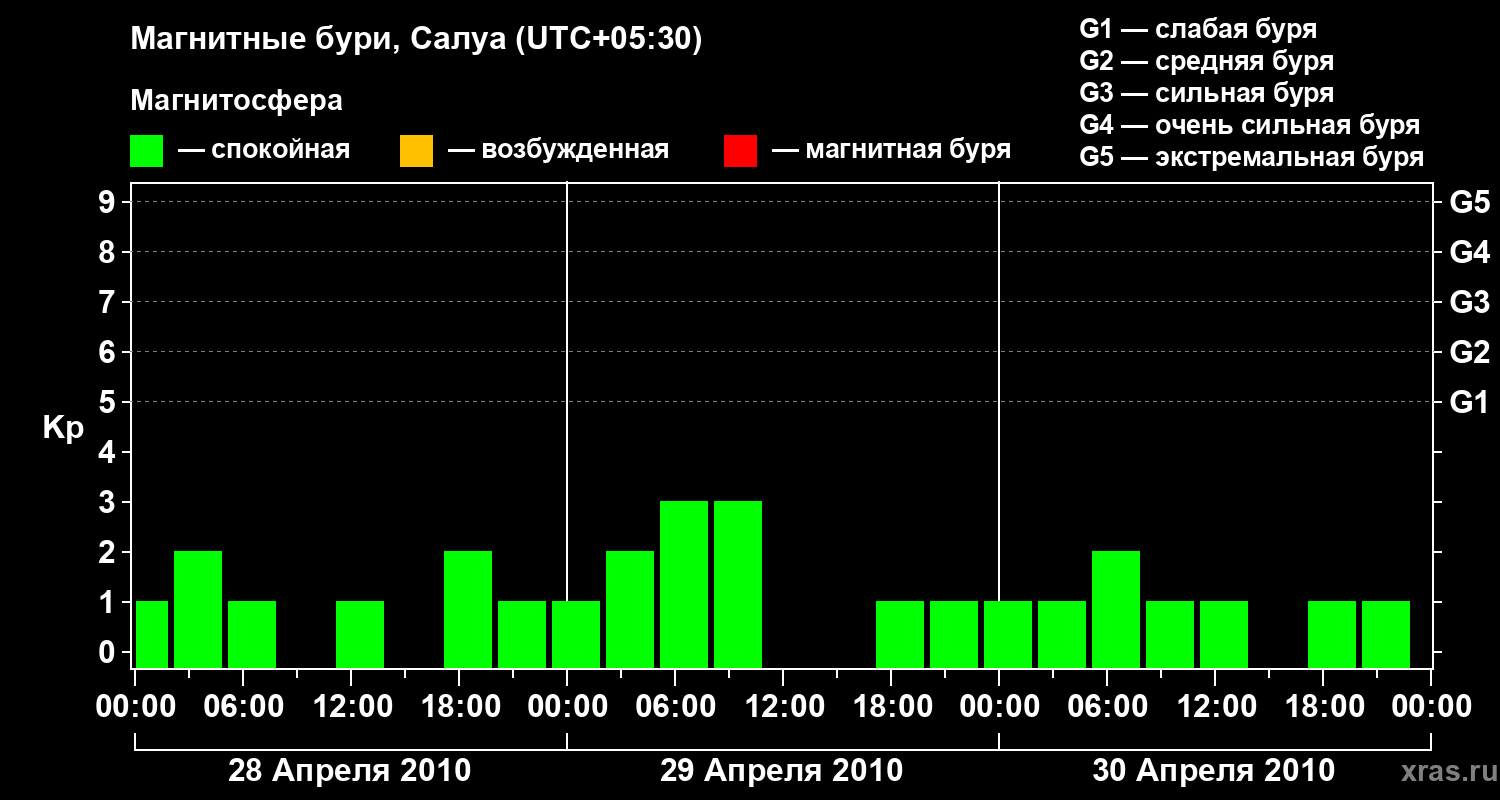 Изменения геомагнитного индекса Kp с 28 по 30 апреля 2010 года для средних широт