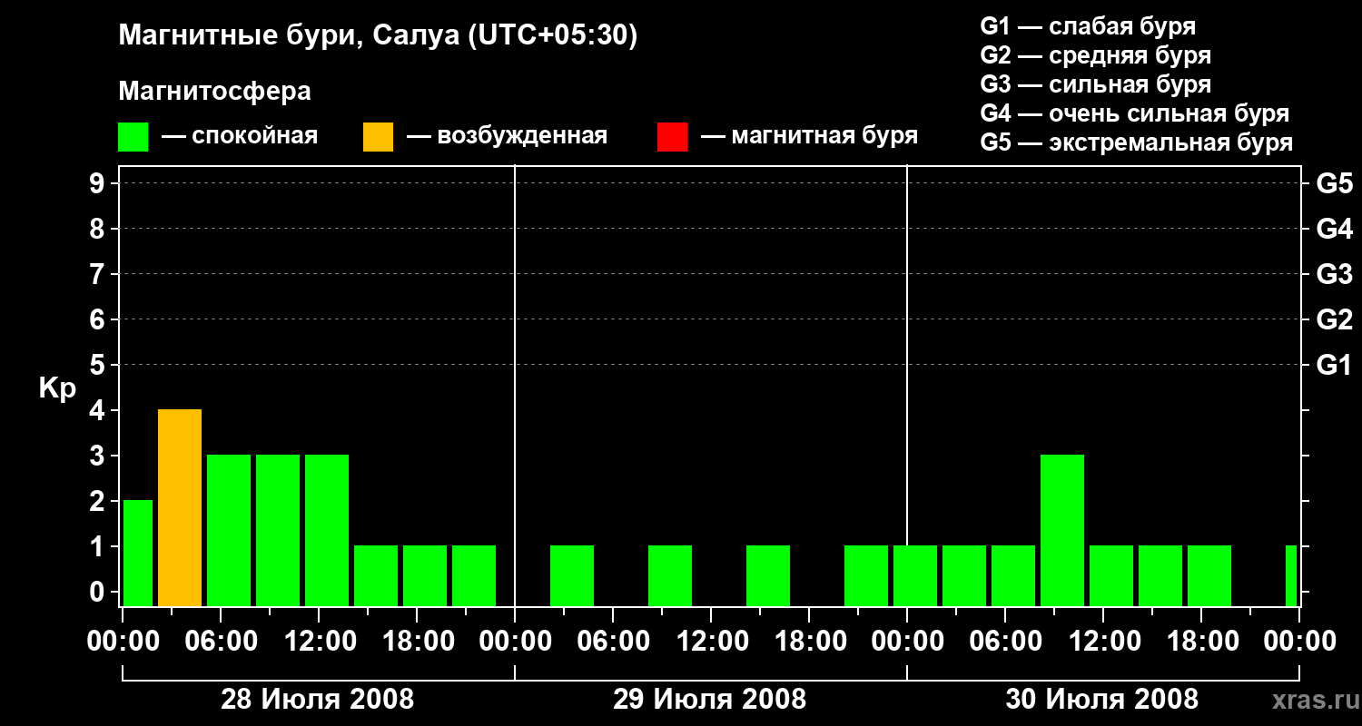 Изменения геомагнитного индекса Kp с 28 по 30 июля 2008 года для средних широт