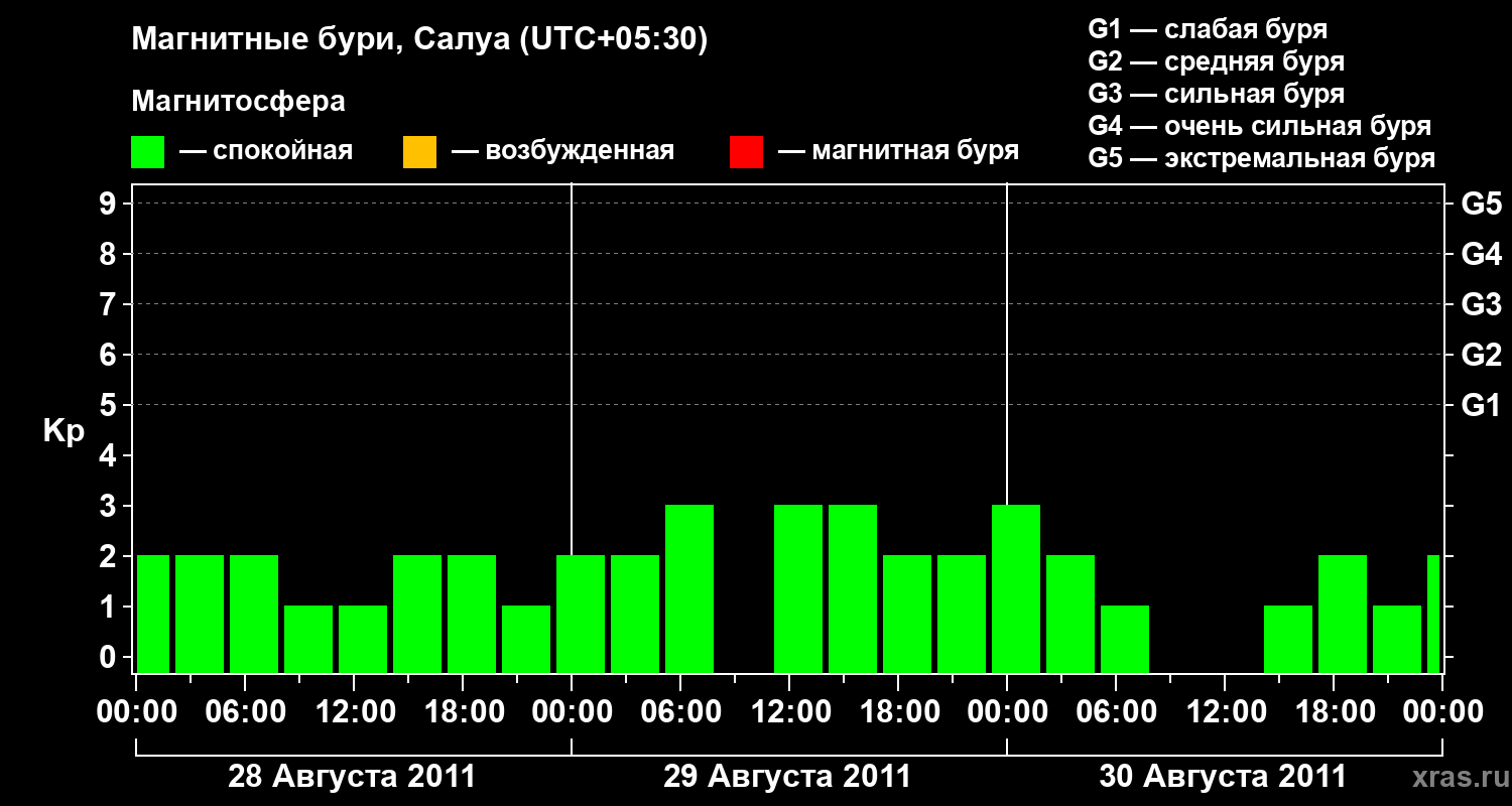 Изменения геомагнитного индекса Kp с 28 по 30 августа 2011 года для средних широт