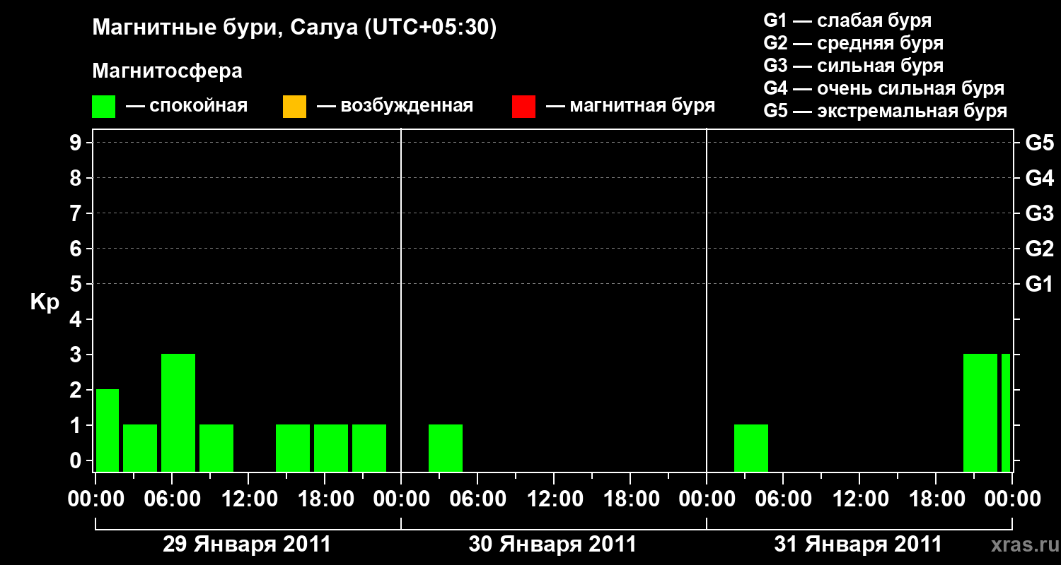 Изменения геомагнитного индекса Kp с 29 по 31 января 2011 года для средних широт