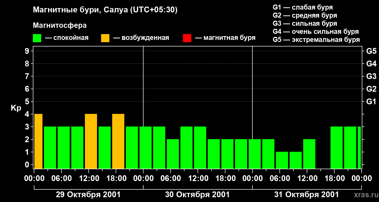 Изменения геомагнитного индекса Kp с 29 по 31 октября 2001 года для средних широт