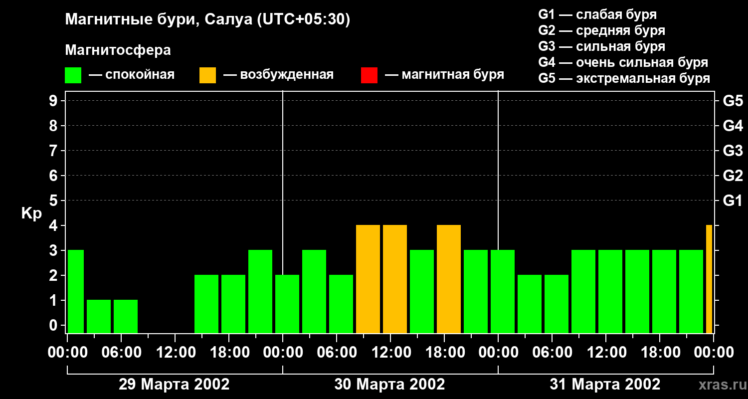 Изменения геомагнитного индекса Kp с 29 по 31 марта 2002 года для средних широт