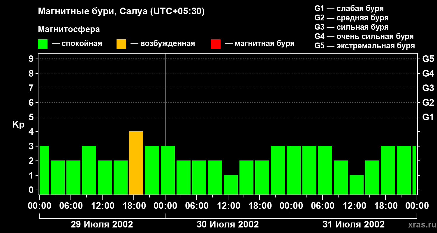 Изменения геомагнитного индекса Kp с 29 по 31 июля 2002 года для средних широт