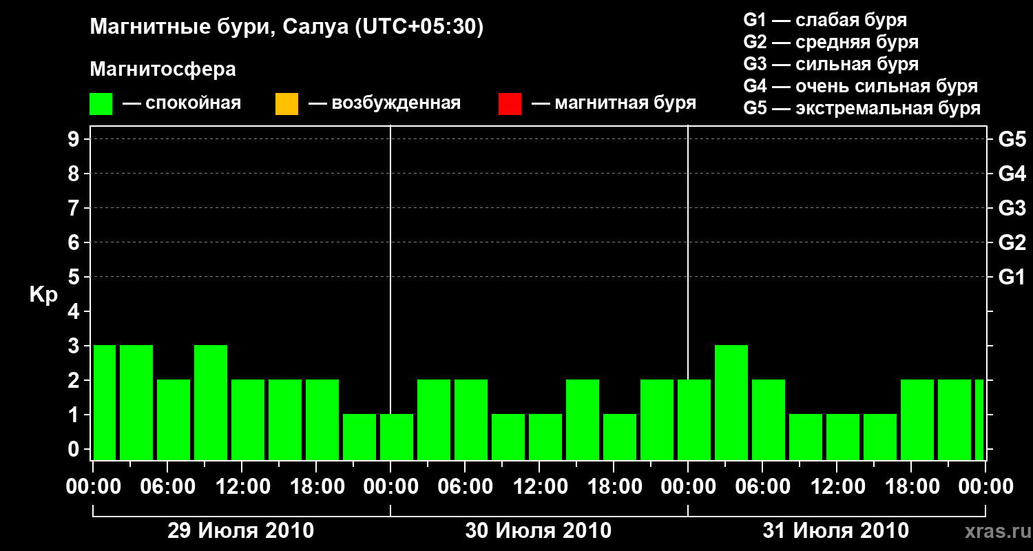 Изменения геомагнитного индекса Kp с 29 по 31 июля 2010 года для средних широт