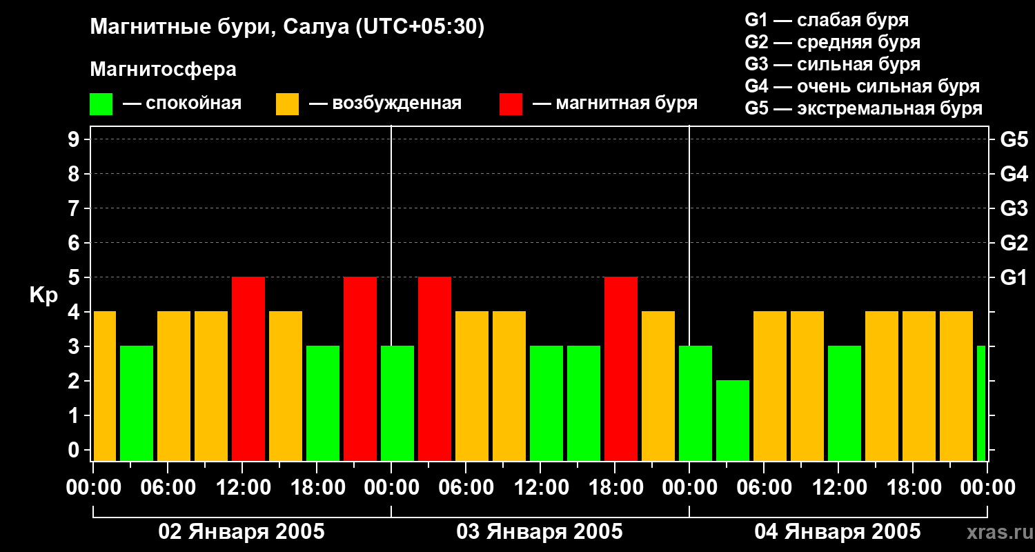 Изменения геомагнитного индекса Kp с 2 по 4 января 2005 года для средних широт