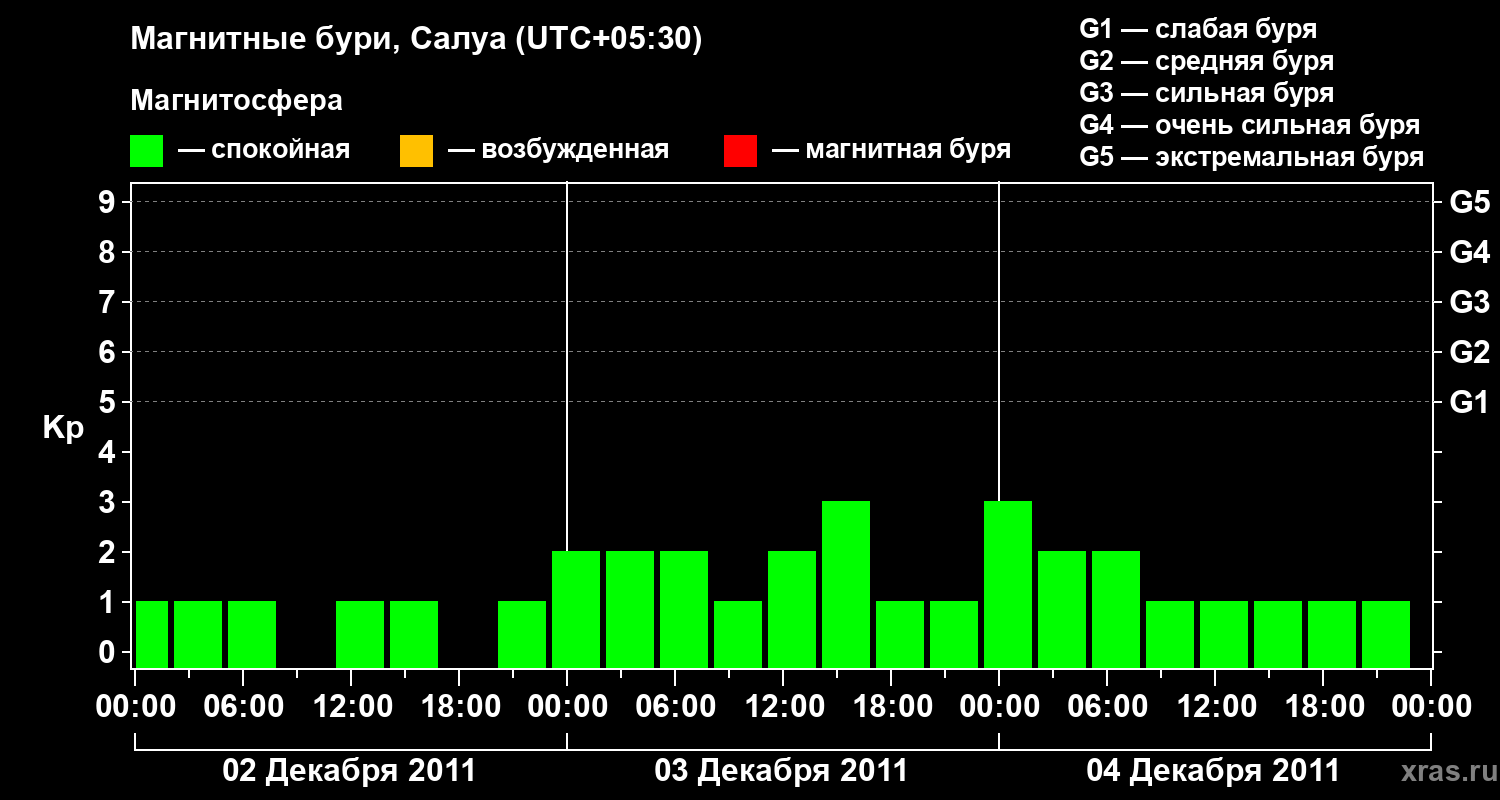 Изменения геомагнитного индекса Kp с 2 по 4 декабря 2011 года для средних широт