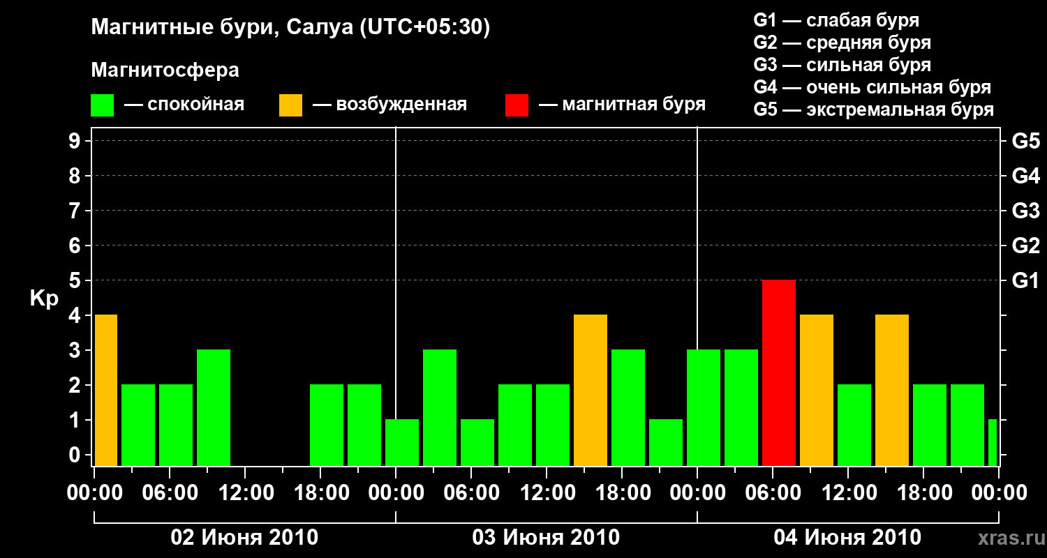 Изменения геомагнитного индекса Kp с 2 по 4 июня 2010 года для средних широт