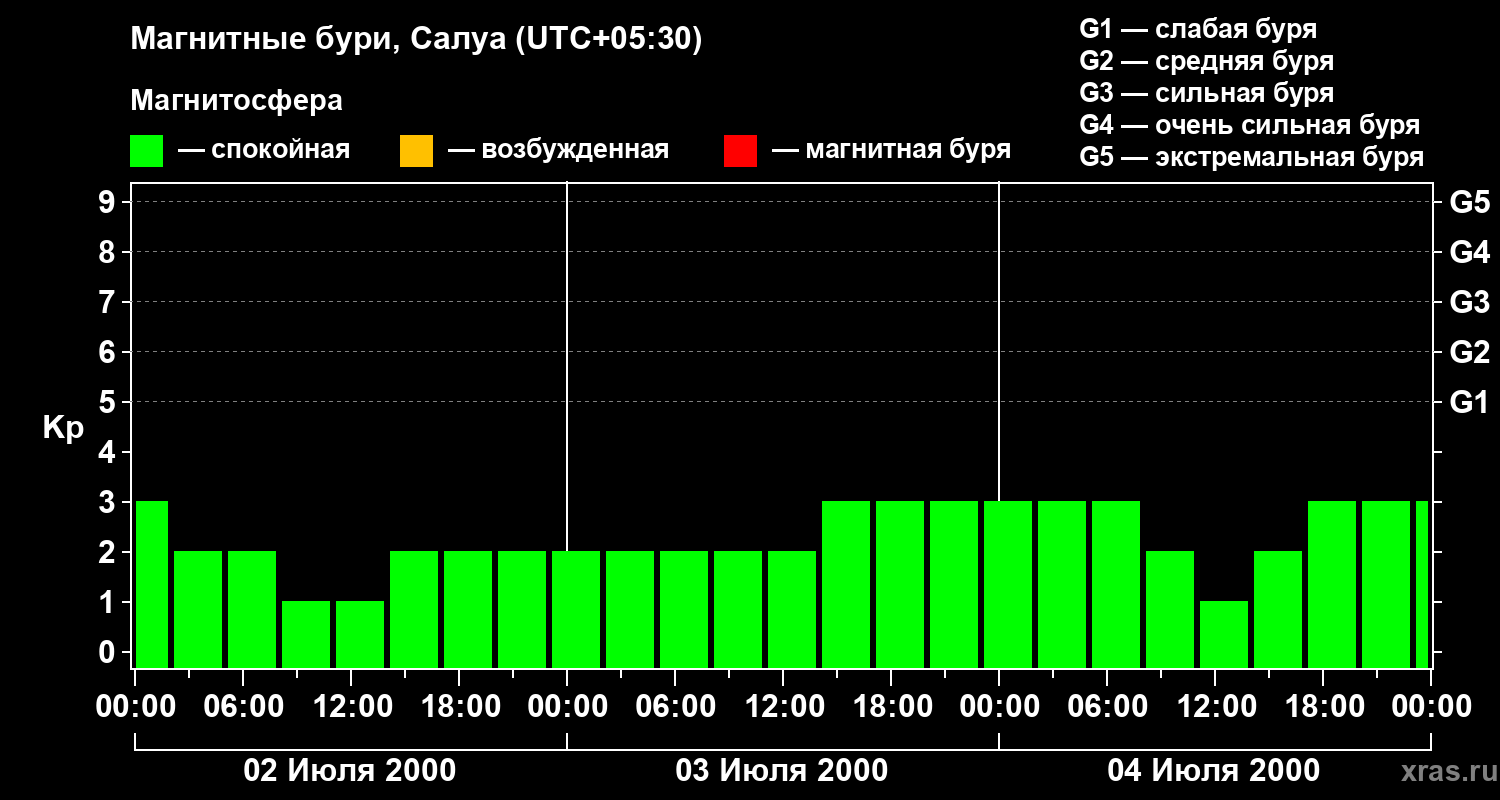 Изменения геомагнитного индекса Kp с 2 по 4 июля 2000 года для средних широт
