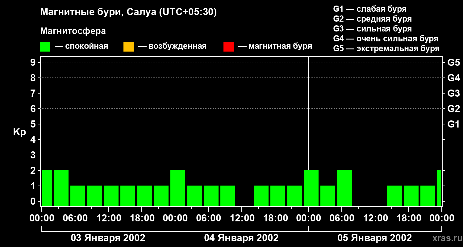 Изменения геомагнитного индекса Kp с 3 по 5 января 2002 года для средних широт