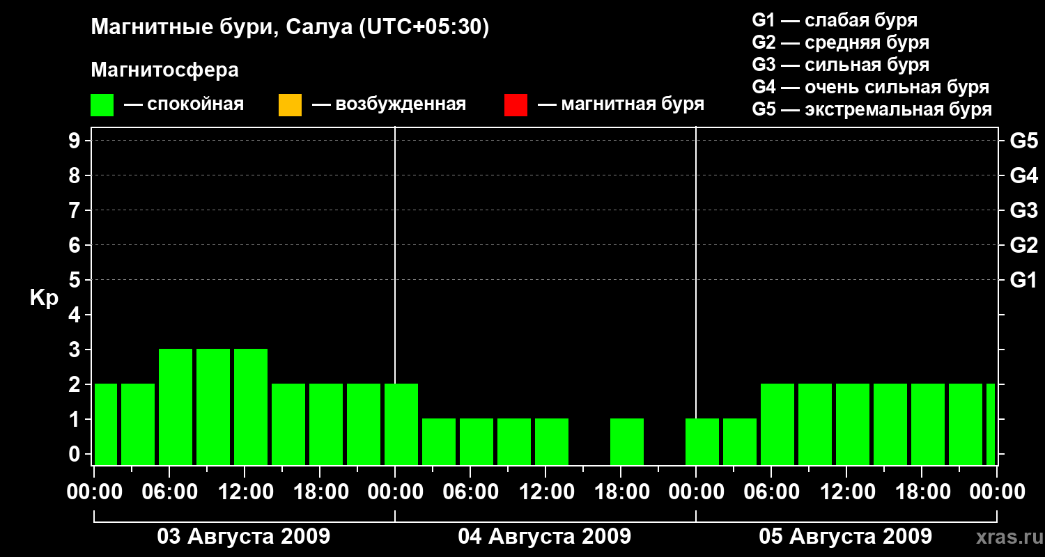 Изменения геомагнитного индекса Kp с 3 по 5 августа 2009 года для средних широт