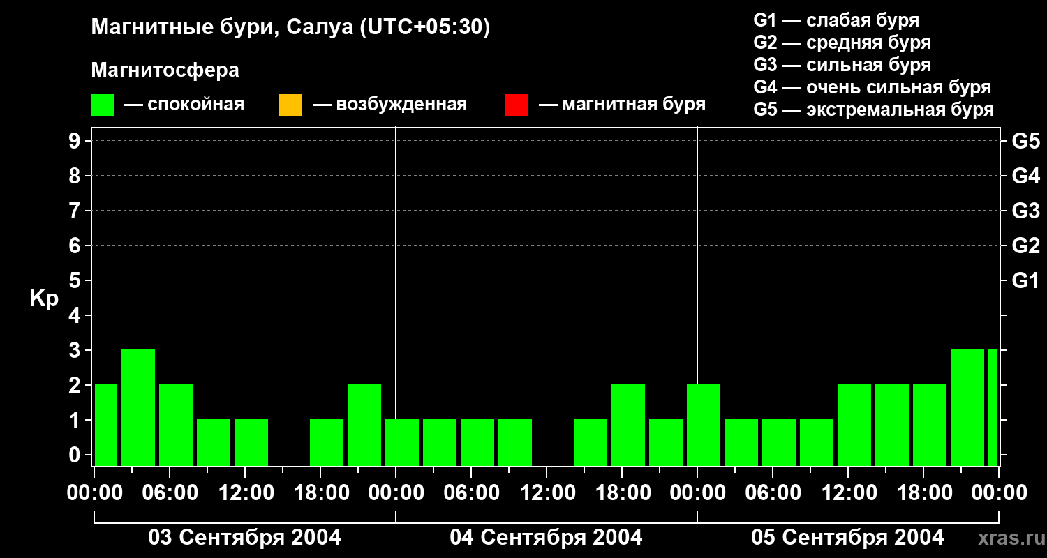 Изменения геомагнитного индекса Kp с 3 по 5 сентября 2004 года для средних широт