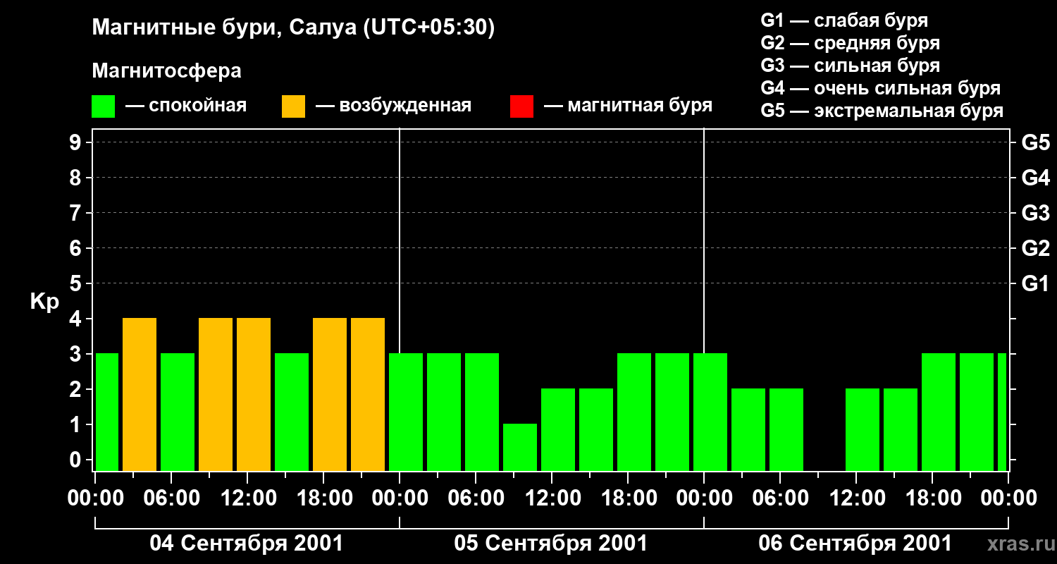 Изменения геомагнитного индекса Kp с 4 по 6 сентября 2001 года для средних широт