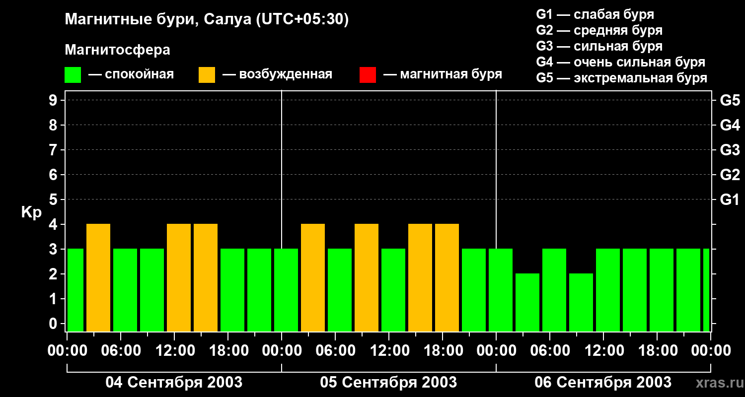 Изменения геомагнитного индекса Kp с 4 по 6 сентября 2003 года для средних широт