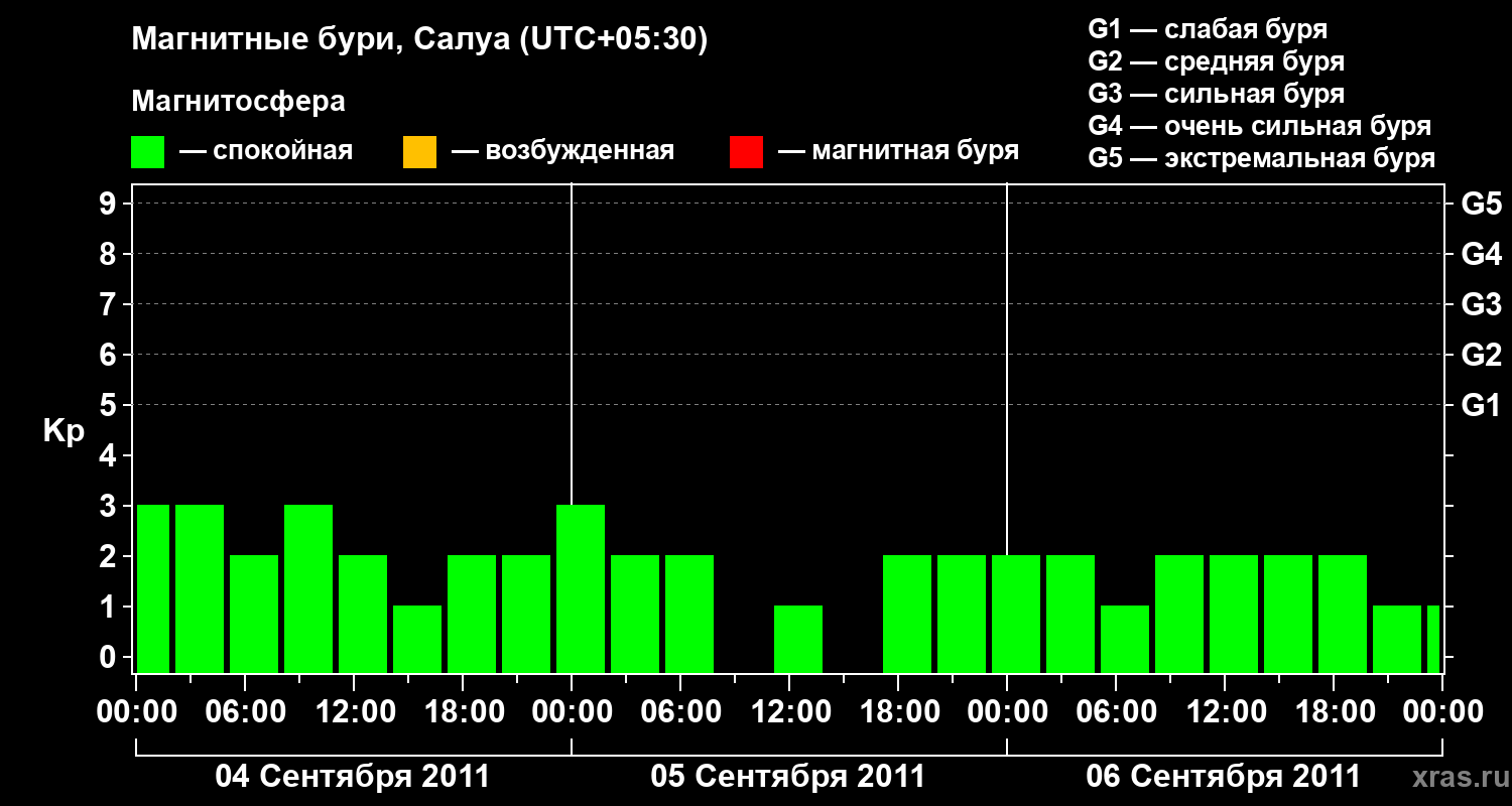 Изменения геомагнитного индекса Kp с 4 по 6 сентября 2011 года для средних широт
