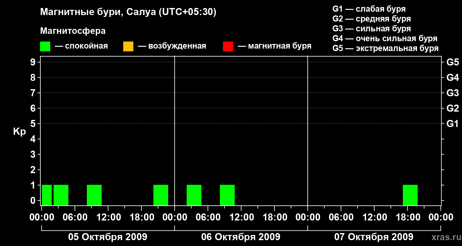 Изменения геомагнитного индекса Kp с 5 по 7 октября 2009 года для средних широт