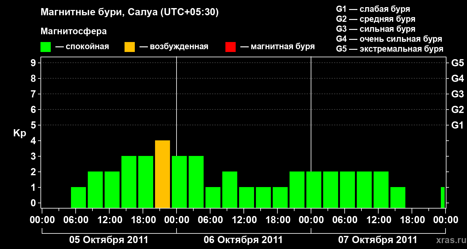 Изменения геомагнитного индекса Kp с 5 по 7 октября 2011 года для средних широт