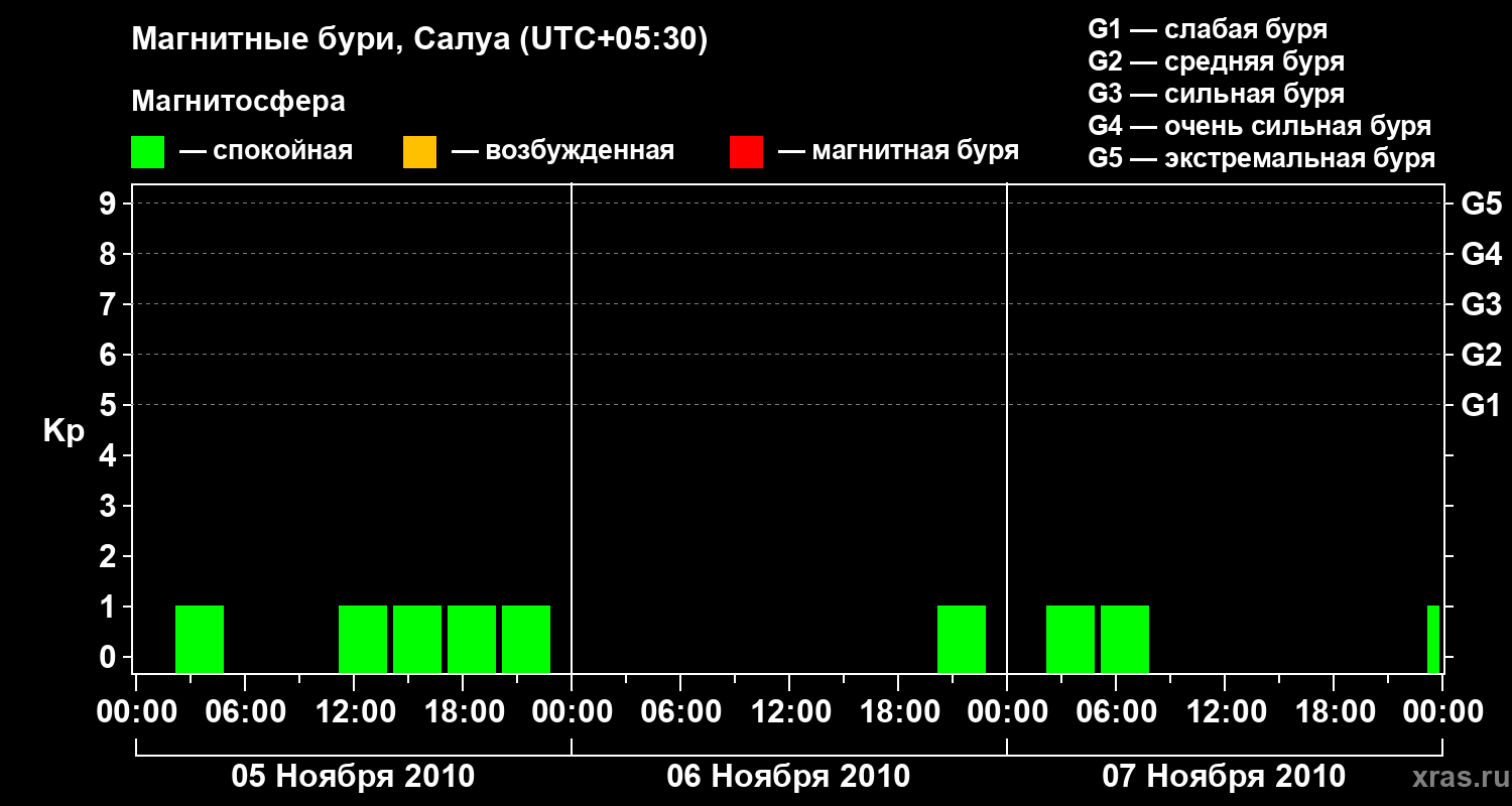 Изменения геомагнитного индекса Kp с 5 по 7 ноября 2010 года для средних широт