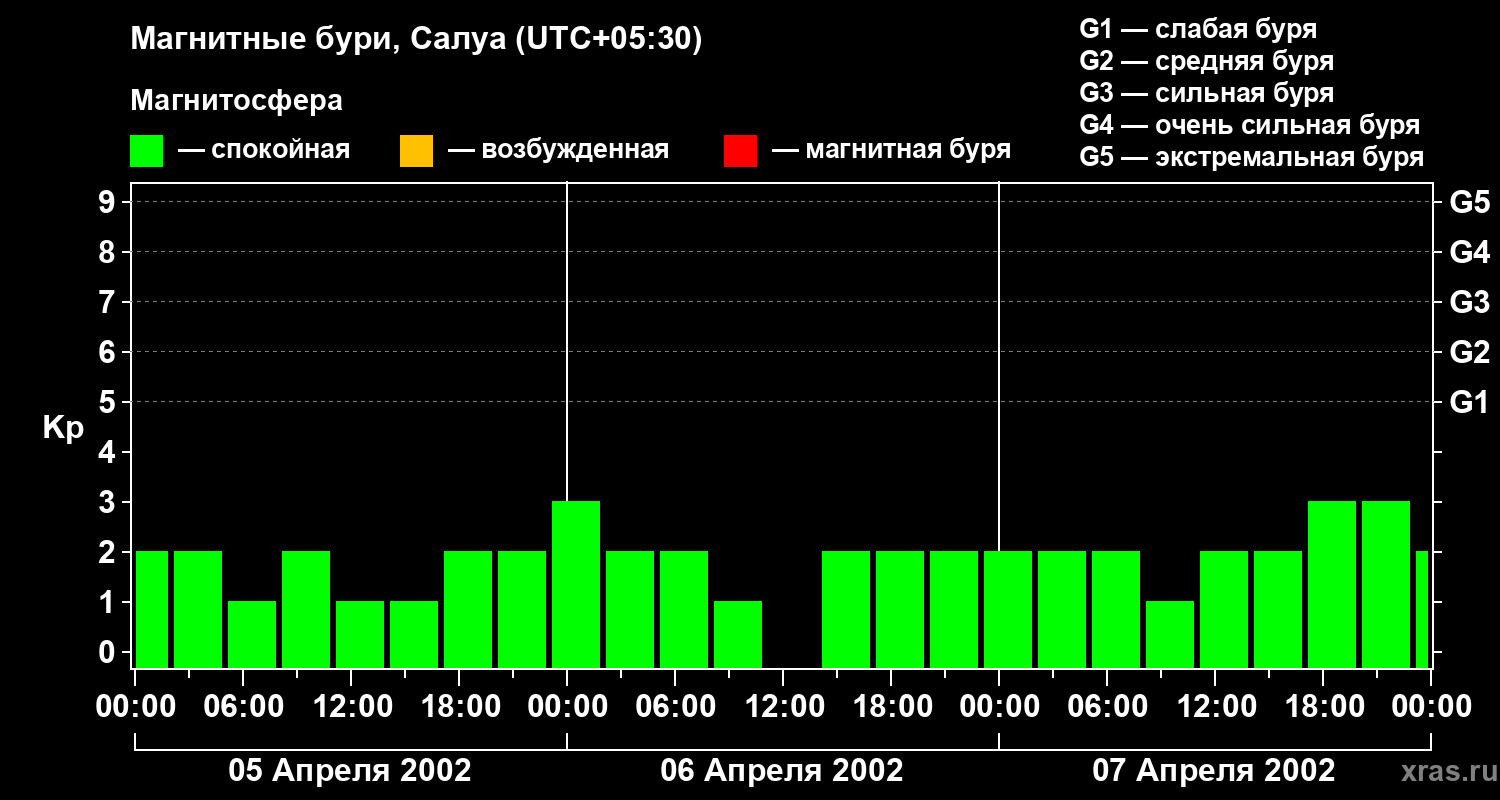 Изменения геомагнитного индекса Kp с 5 по 7 апреля 2002 года для средних широт
