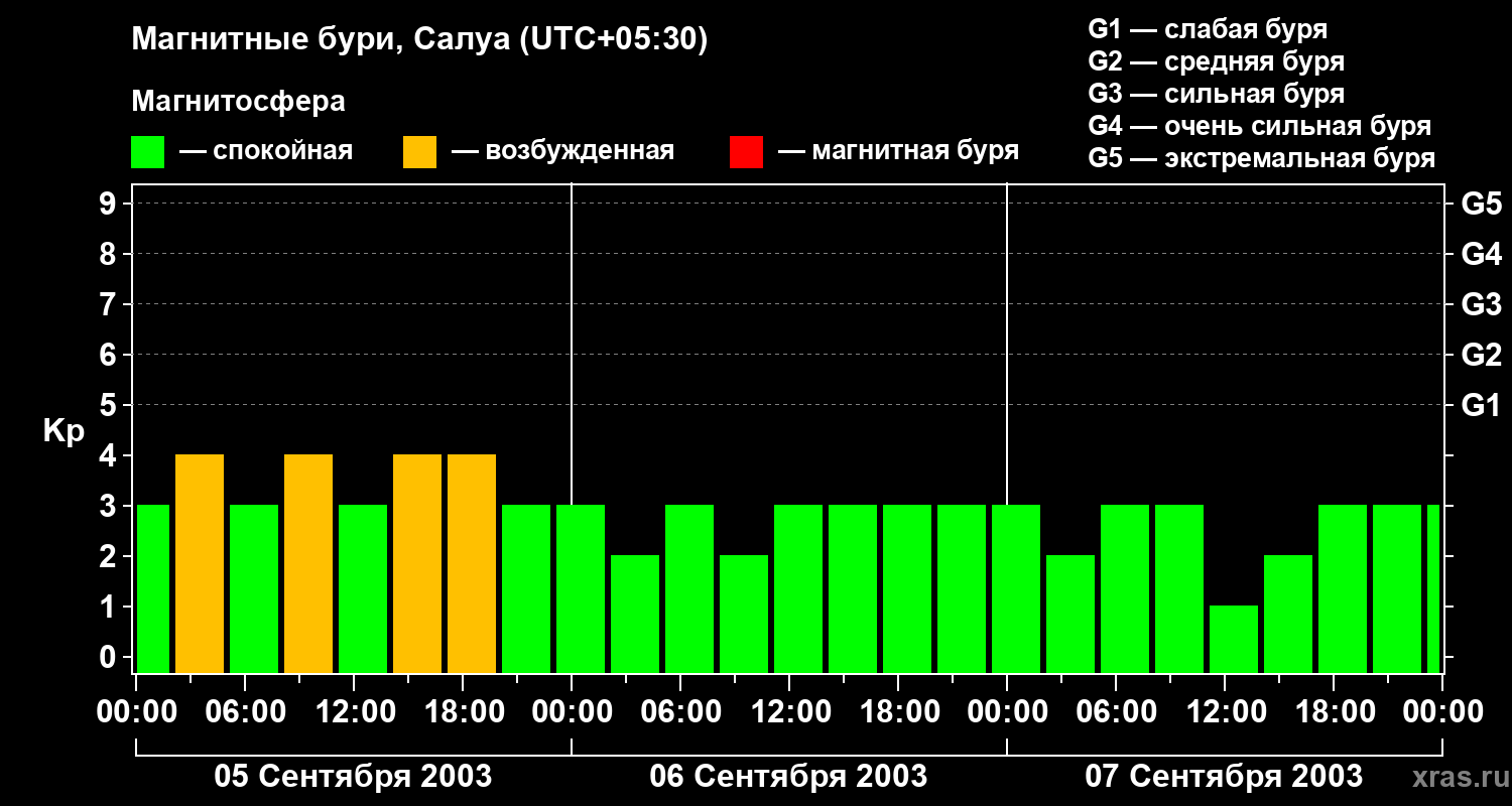 Изменения геомагнитного индекса Kp с 5 по 7 сентября 2003 года для средних широт