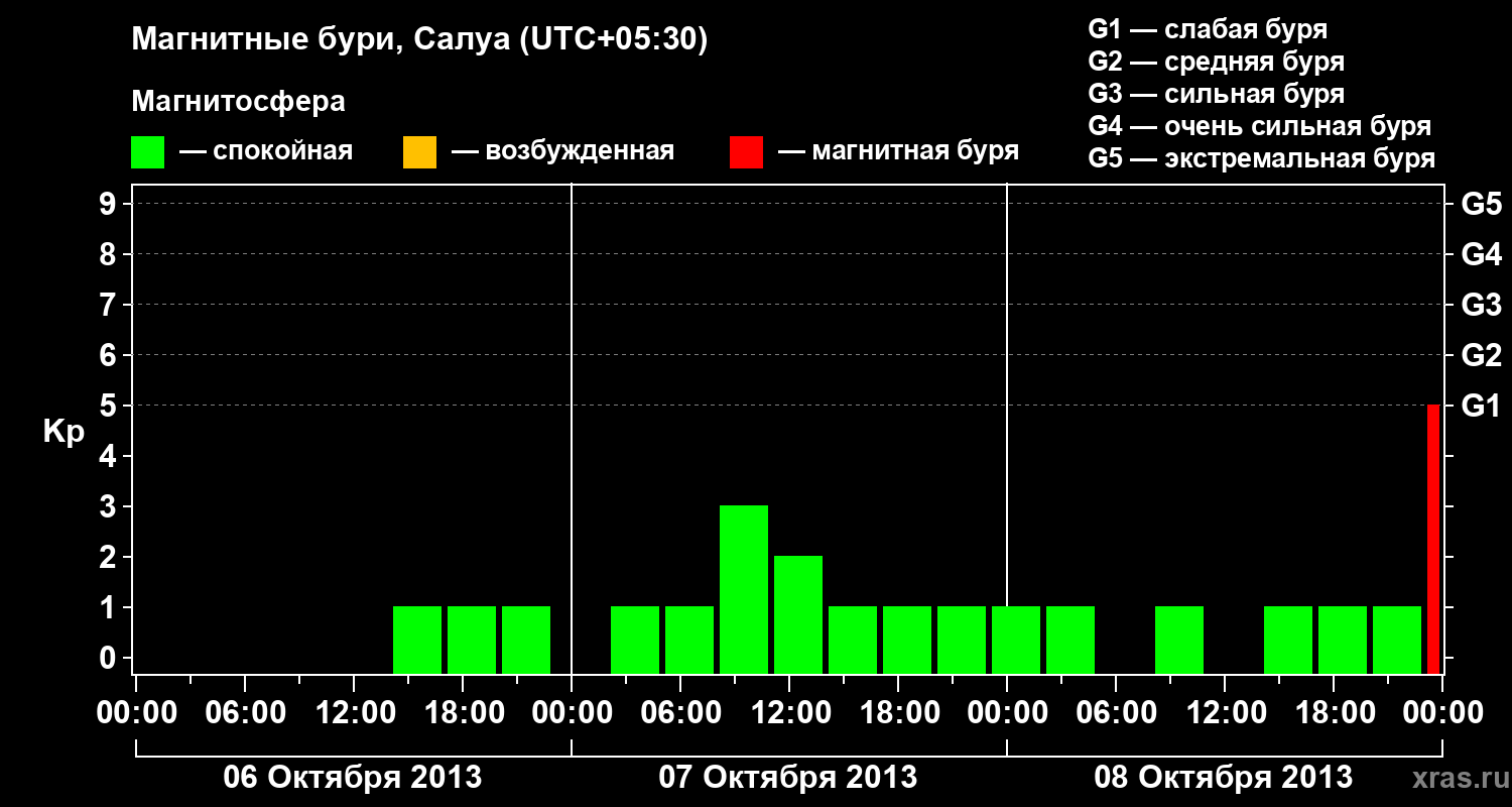 Изменения геомагнитного индекса Kp с 6 по 8 октября 2013 года для средних широт