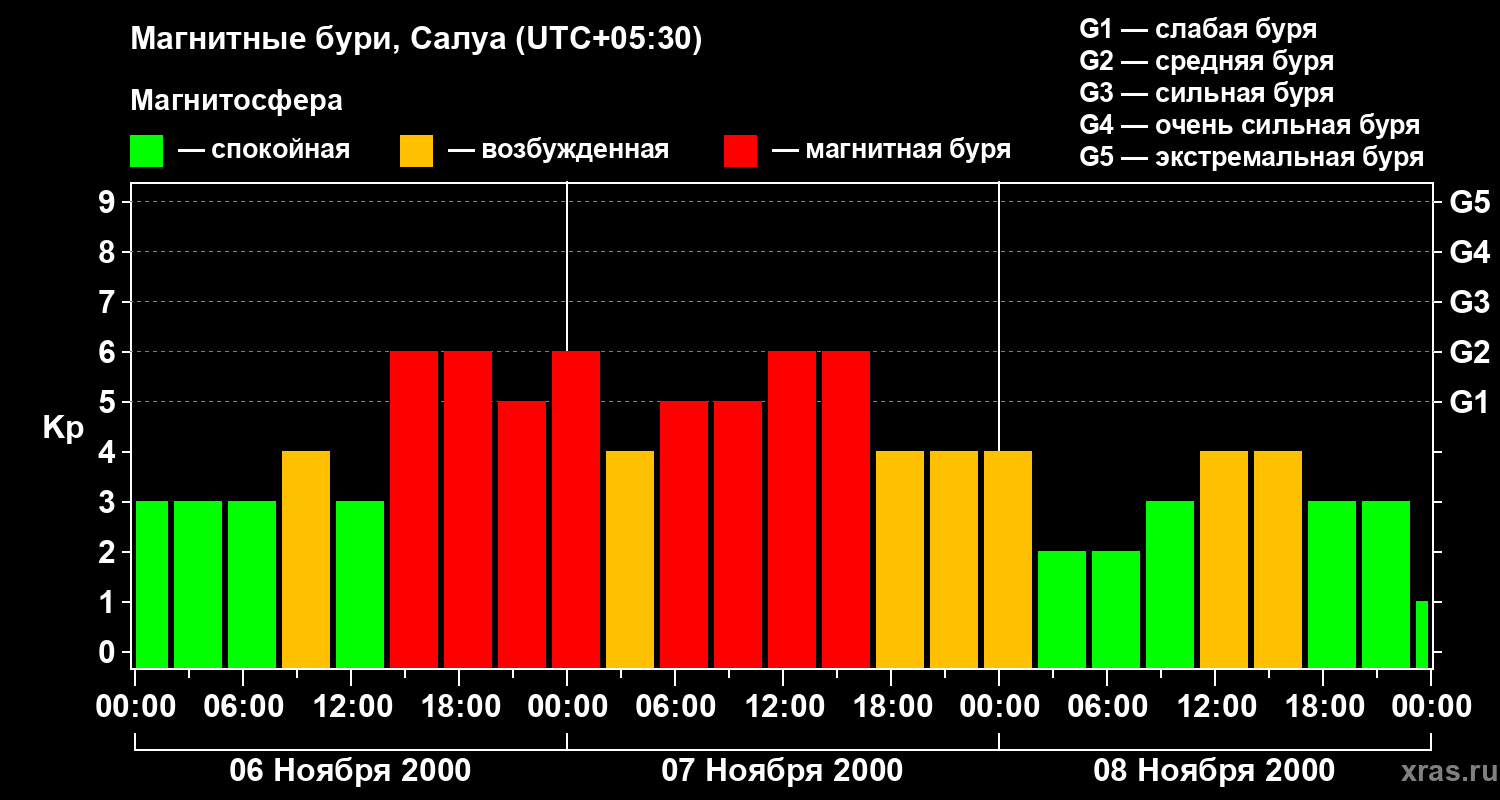 Изменения геомагнитного индекса Kp с 6 по 8 ноября 2000 года для средних широт